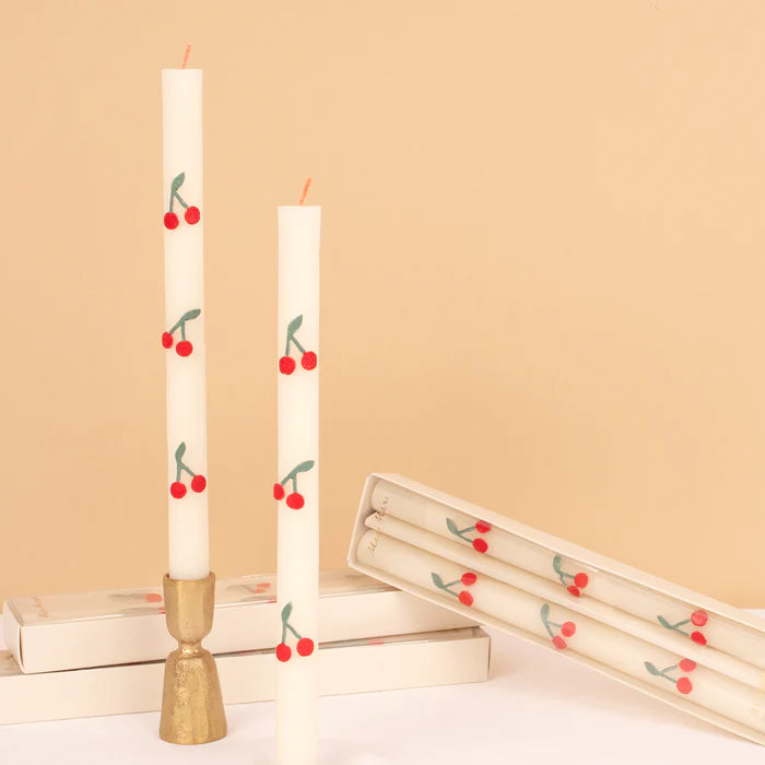 Veraniegas y divertidas... las cerezas son el diseño imprescindible para darle un toque fresco a tus fiestas. Estas velas color marfil presentan vibrantes cerezas de cera con un acabado pintado a mano. Y, para un toque realmente especial, ¡también hemos añadido mechas rojas! Estas velas de mesa son ideales para cenas o para ambientar una fiesta en el jardín. Son un regalo encantador para cualquier amante de las velas decorativas.